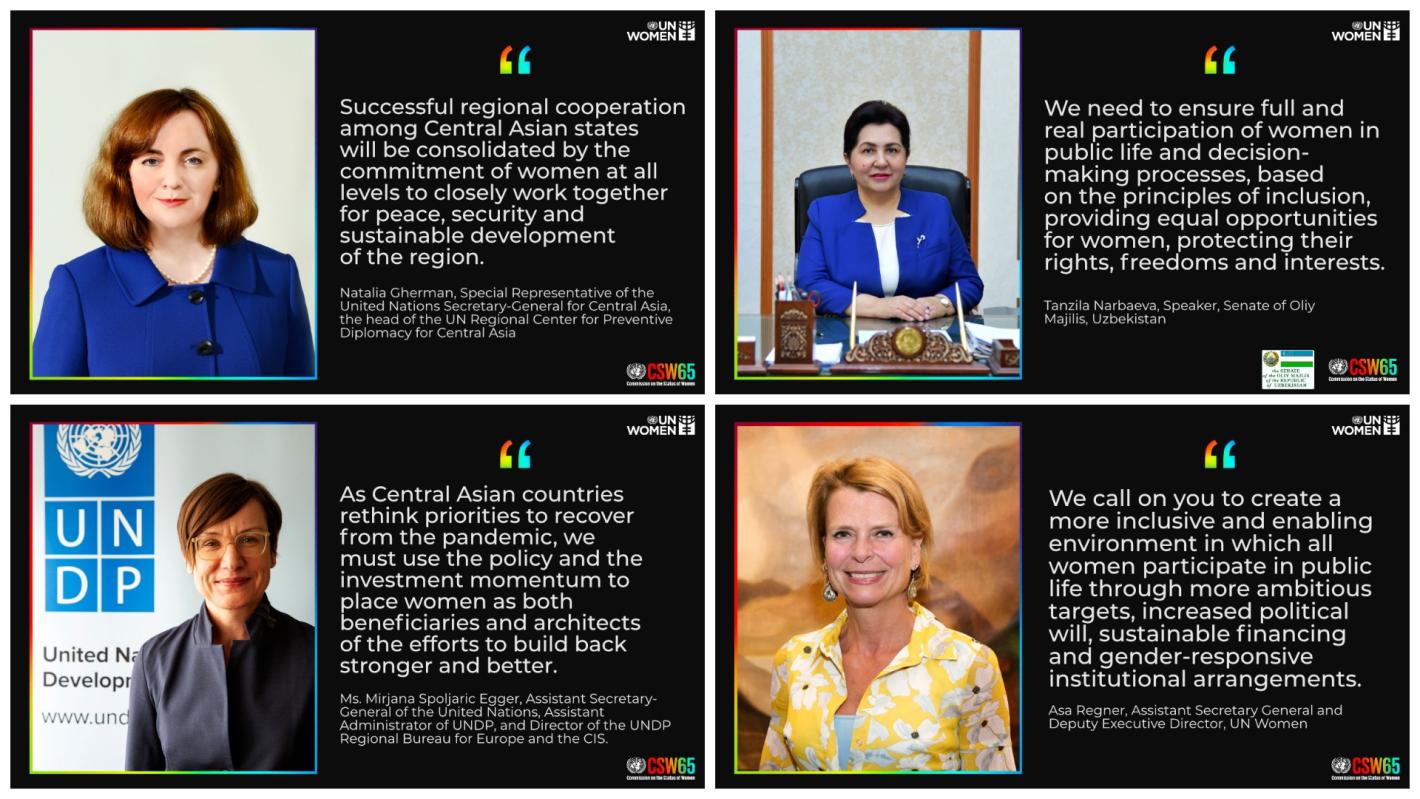 On 23 February 2021, SRSG Natalia Gherman participated in the regional consultations within the framework of the Women Leaders’ Caucus of Central Asian states in preparation for the 65th session of the UN Commission on the Status of Women (CSW).