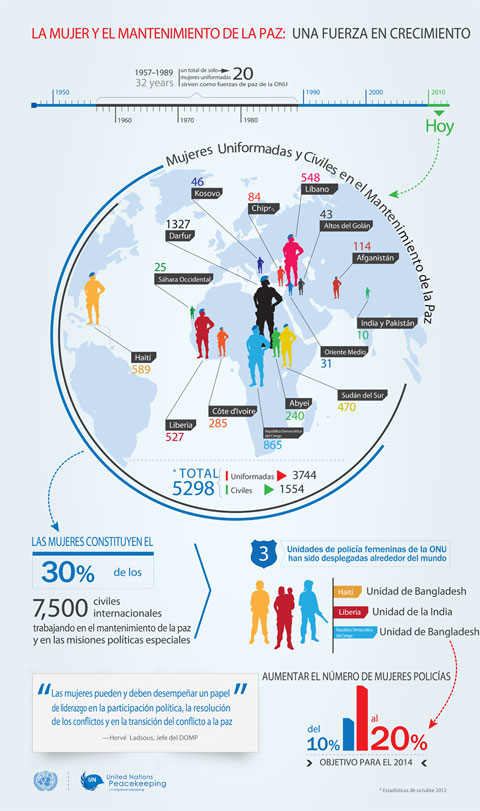 El Mantenimiento de la Paz de las Naciones Unidas aboga por el despliegue de más mujeres. La resolución 1325 del Consejo de Seguridad sobre Mujeres, Paz y Seguridad supuso una resolución histórica en la que se abordaba, por primera vez, el desproporcionado y singular impacto del conflicto armado en las mujeres. Reconocía las contribuciones infravaloradas e infrautilizadas que las mujeres aportaban en materia de prevención de conflictos, mantenimiento de la paz, resolución de conflictos y consolidación de la paz. El Mantenimiento de la Paz de las Naciones Unidas se sirvió de la resolución 1325 y de otras para implementar el programa de Mujeres, Paz y Seguridad, así como para aumentar el número de mujeres en el mantenimiento de la paz.