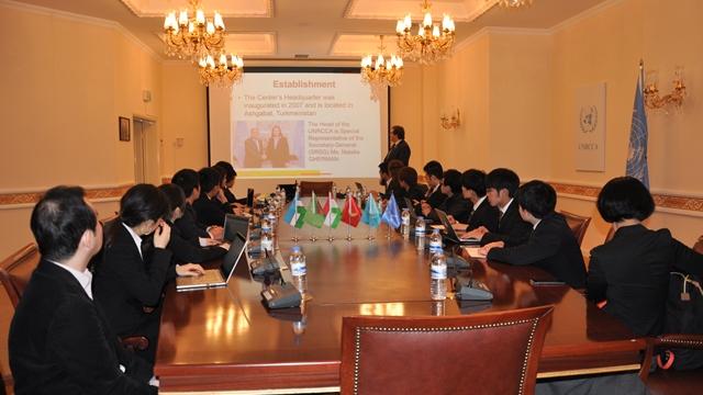6 марта, в рамках мандата по содействию превентивной дипломатии, РЦПДЦА провел лекцию для группы студентов Токийского университета о создании, мандате, целях и достижениях Центра. В ходе презентации гости ознакомились со структурой и направлениями деятельности миссии в сферах превентивной дипломатии. Группу из Токийского университета сопровождали преподаватель и студенты Института Международных отношений МИД Туркменистана. После сессии состоялся обмен вопросами и ответами, в ходе которого японские студенты продемонстрировали большой интерес к опыту деятельности Центра в регионе Центральной Азии и взаимодействия с Афганистаном.